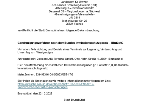 Die vorstehende Bekanntmachung 11/2026 der Stadt Brunsbüttel steht ab dem 02.03.2026 bis zum 16.03.2026 auf der Homepage der Stadt Brunsbüttel unter www.stadt.brunsbuettel.de zur Verfügung. Die Bekanntmachung enthält Bekanntmachung des Landesamtes für Umwelt des Landes Schleswig-Holstein (LfU) über…