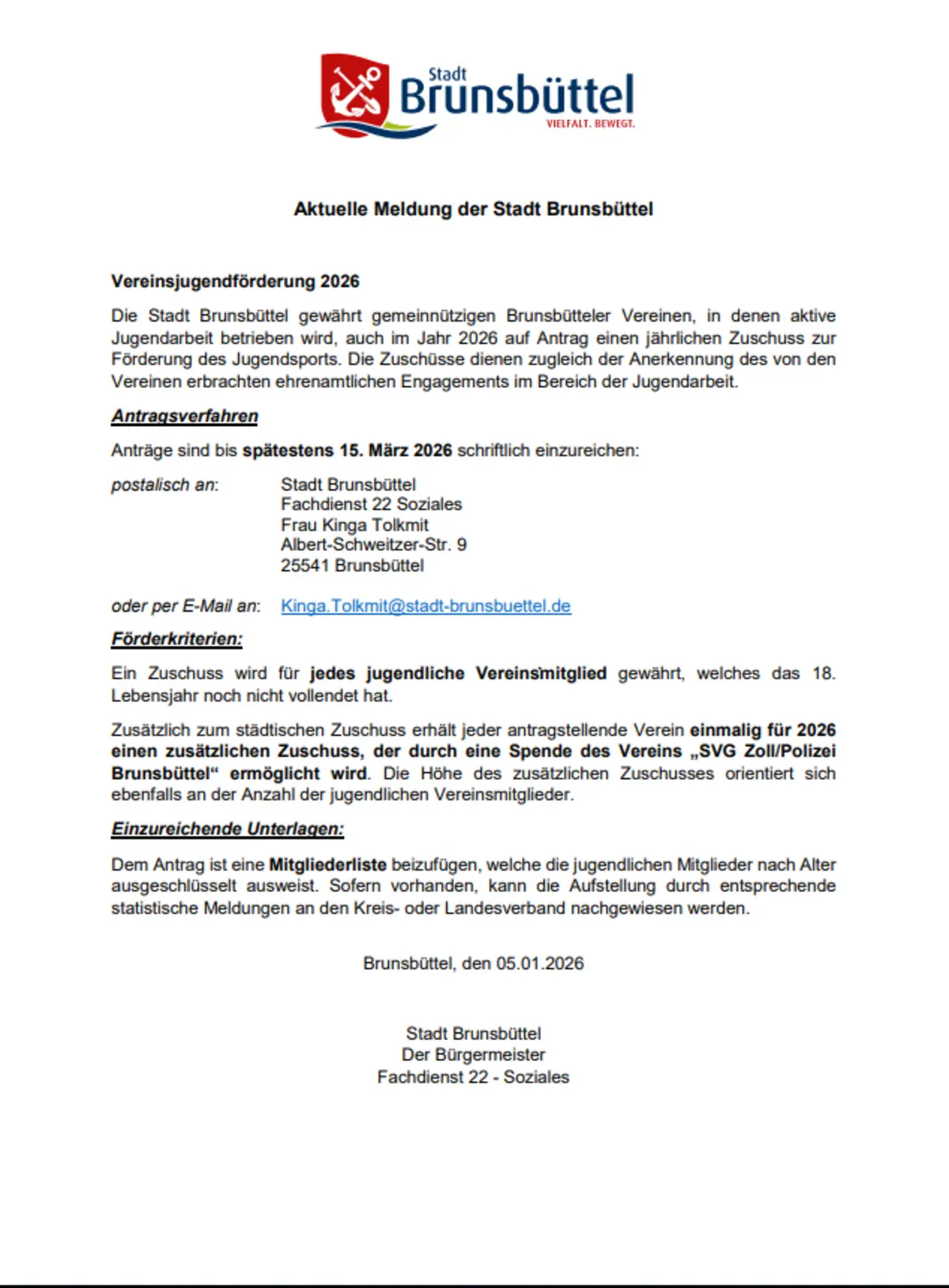 Die Stadt Brunsbüttel gewährt gemeinnützigen Brunsbütteler Vereinen, in denen aktive Jugendarbeit betrieben wird, auch im Jahr 2026 auf Antrag einen jährlichen Zuschuss zur Förderung des Jugendsports.