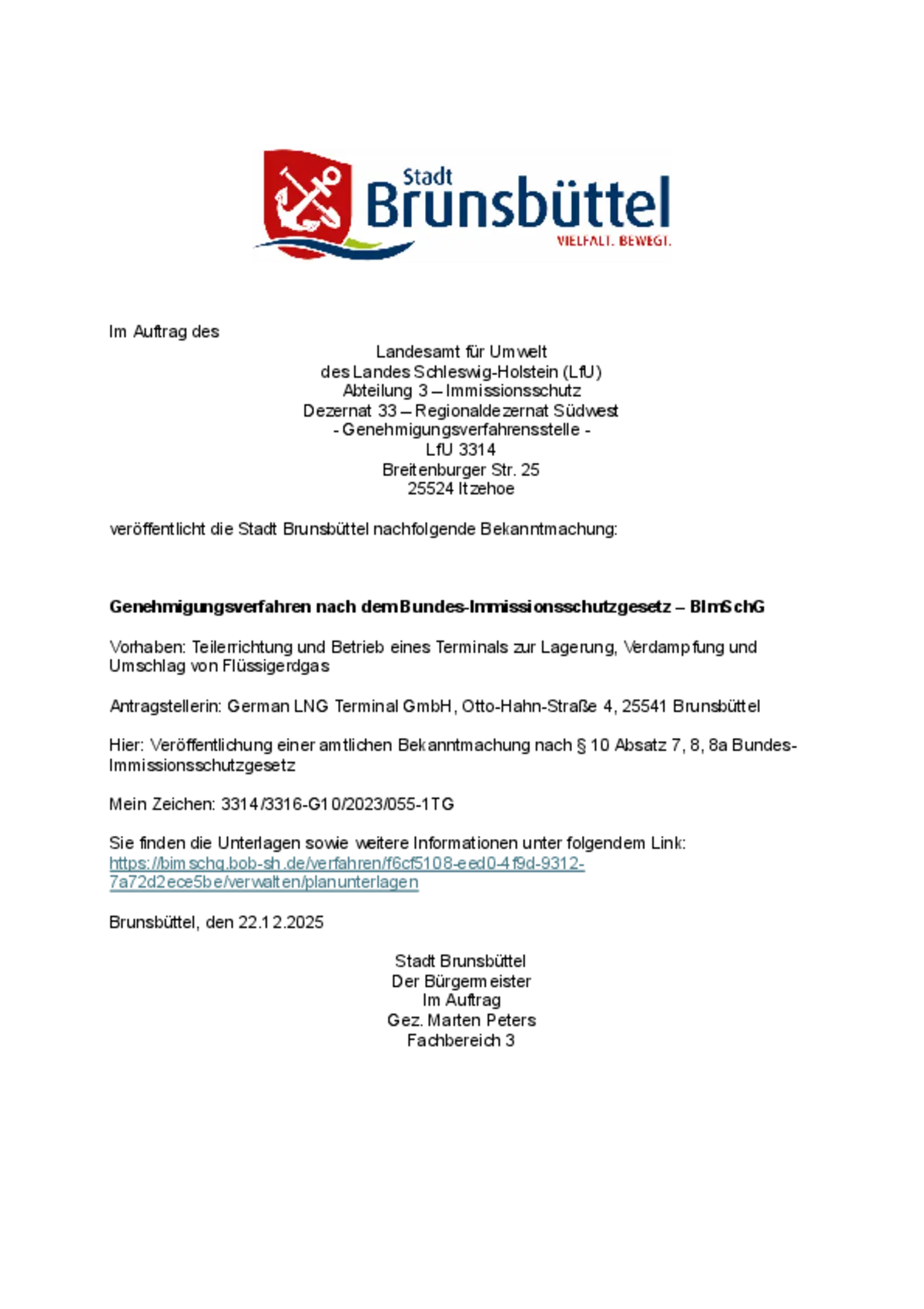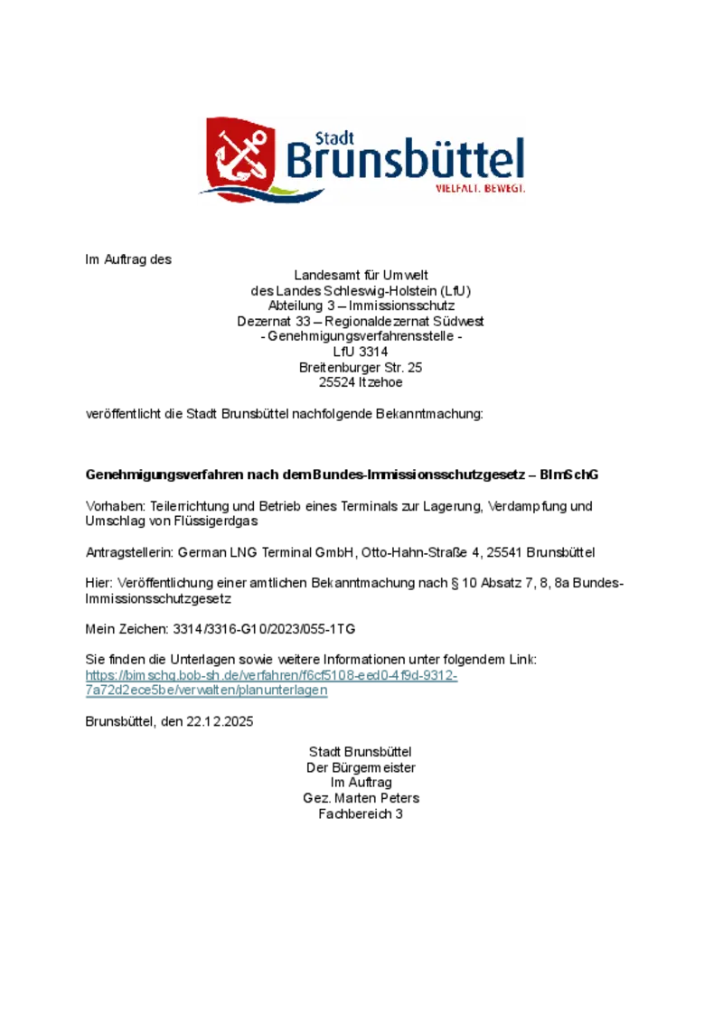 Die vorstehende Bekanntmachung 11/2026 der Stadt Brunsbüttel steht ab dem 02.03.2026 bis zum 16.03.2026 auf der Homepage der Stadt Brunsbüttel unter www.stadt.brunsbuettel.de zur Verfügung. Die Bekanntmachung enthält Bekanntmachung des Landesamtes für Umwelt des Landes Schleswig-Holstein (LfU) über das Genehmigungsverfahren nach dem Bundes-Immissionsschutzgesetz - BlMSchG.