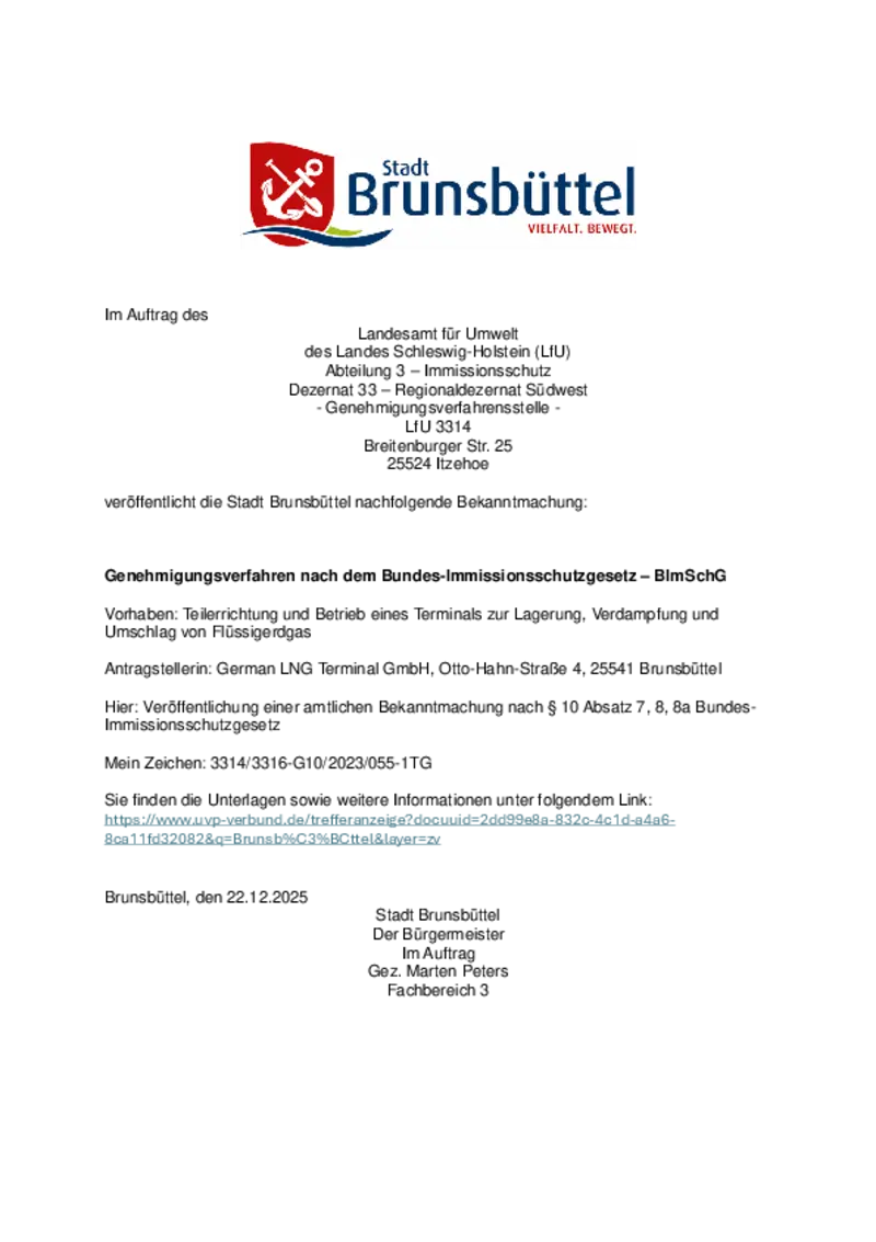 Die vorstehende Bekanntmachung 12/2026 der Stadt Brunsbüttel steht ab dem 02.03.2026 bis zum 16.04.2026 auf der Homepage der Stadt Brunsbüttel unter www.stadt.brunsbuettel.de zur Verfügung. Die Bekanntmachung enthält Bekanntmachung des Landesamtes für Umwelt des Landes Schleswig-Holstein (LfU) über das Genehmigungsverfahren nach dem Bundes-Immissionsschutzgesetz - BlMSchG.