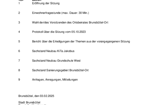 Die vorstehende Bekanntmachung 8/2025 der Stadt Brunsbüttel steht ab dem 06.02.2025 auf der Homepage der Stadt Brunsbüttel unter www.stadt.brunsbuettel.de zur Verfügung. Die Bekanntmachung enthält die Sitzung des Ortsbeirates Brunsbüttel Ort.