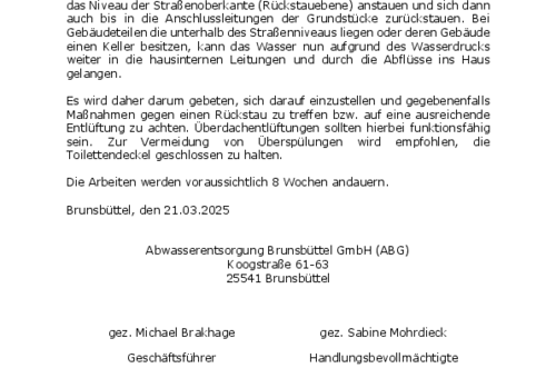 Neben den stattfindenden Kanalnetzuntersuchungen wird ab dem 31.03.2025 wieder mit den alljährlichen Spülarbeiten in der Schmutzwasserkanalisation in Brunsbüttel begonnen, um Ablagerungen in den Kanalleitungen zu beseitigen und Verstopfungen zu vermeiden. Die Arbeiten werden voraussichtlich 8 Wochen…