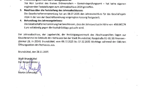 Die vorstehende Bekanntmachung 57/2025 der Stadt Brunsbüttel steht ab dem 03.12.2025 auf der Homepage der Stadt Brunsbüttel unter www.stadt.brunsbuettel.de zur Verfügung. Die Bekanntmachung enthält den Jahresabschluss und Lagebericht für das Wirtschaftsjahr 2024 der städtischen Beteiligung…
