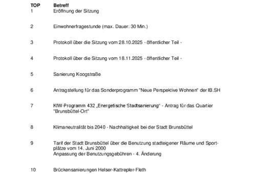 Die vorstehende Bekanntmachung 54/2025 der Stadt Brunsbüttel steht ab dem 14.11.2025 auf der Homepage der Stadt Brunsbüttel unter www.stadt.brunsbuettel.de zur Verfügung. Die Bekanntmachung enthält die Sitzung des Bauausschusses am 24.11.2025.