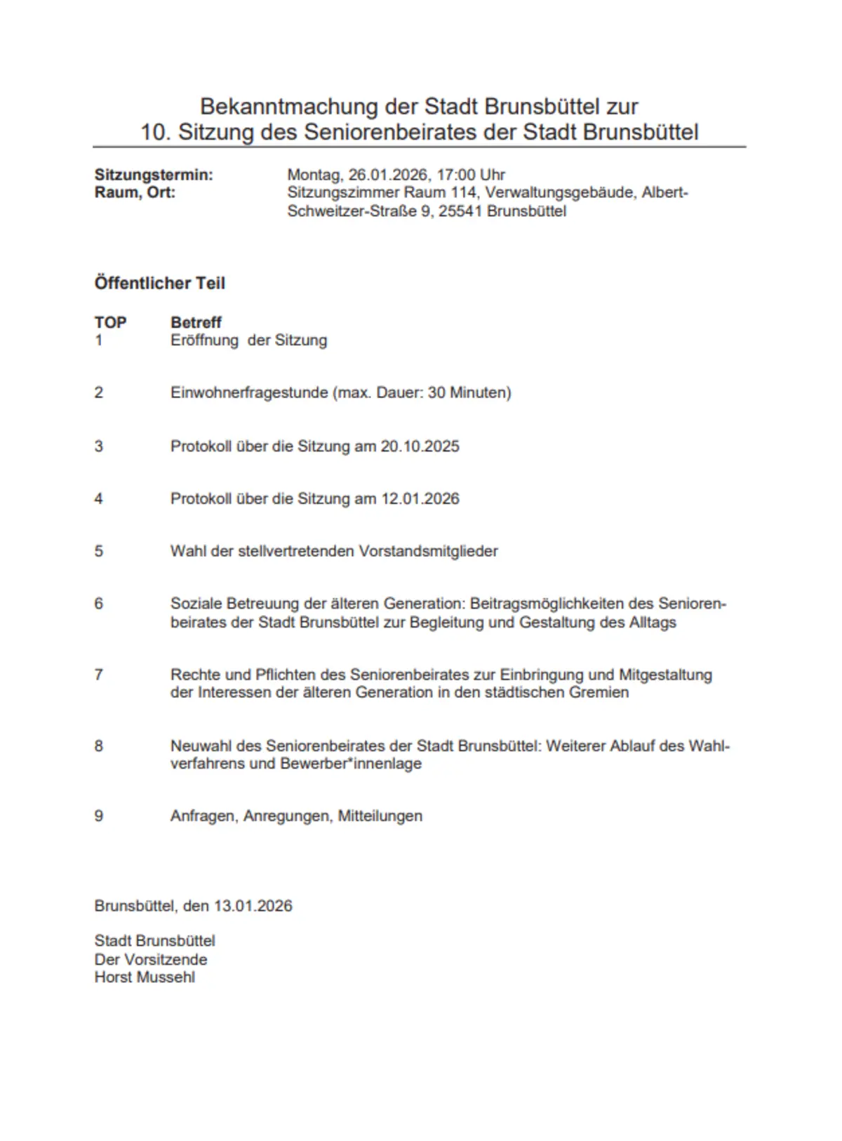 Bekanntmachung 04/2026 zur 10. Sitzung des Seniorenbeirates der Stadt Brunsbüttel