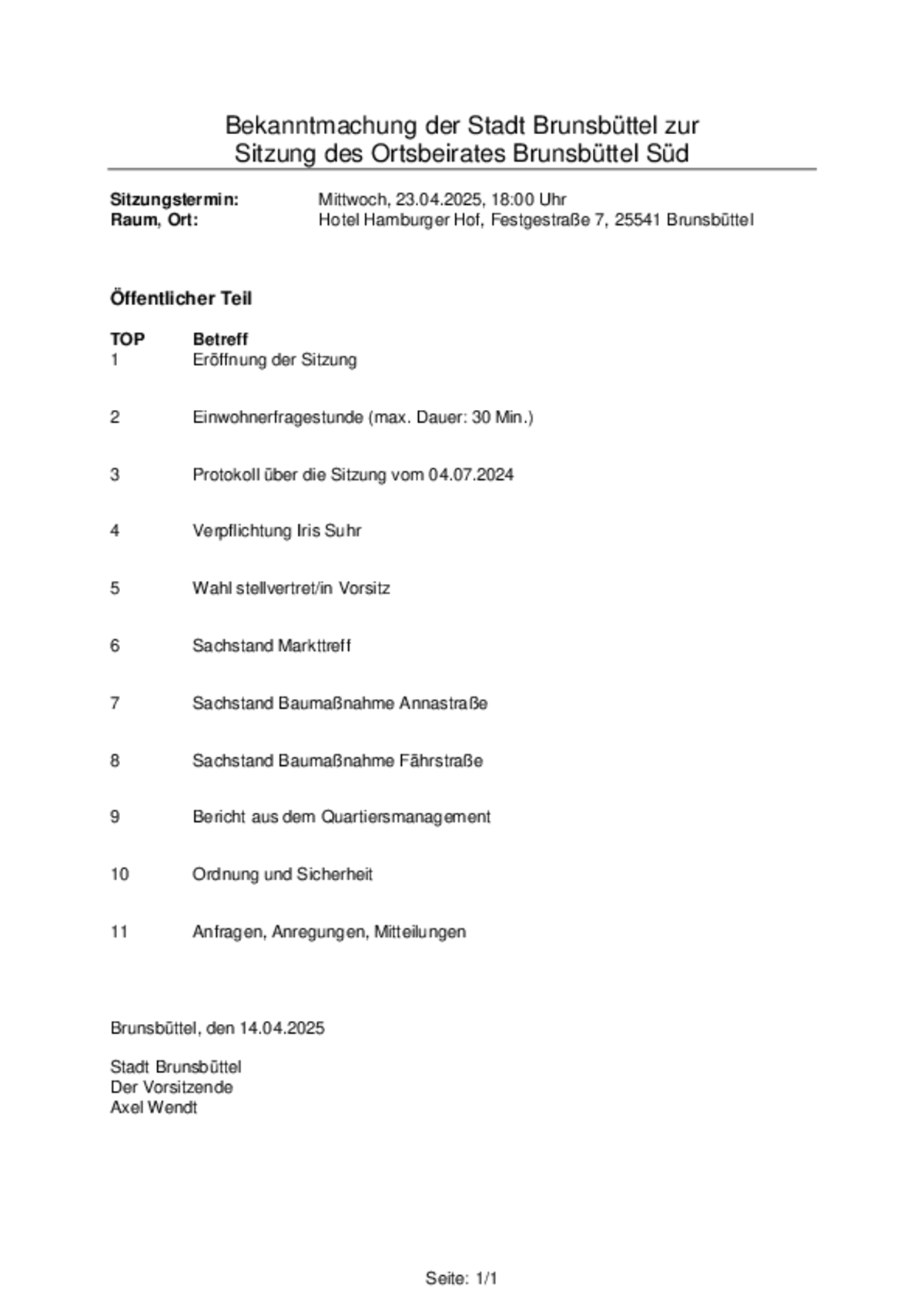 Die vorstehende Bekanntmachung 20/2025 der Stadt Brunsbüttel steht ab dem 15.04.2025 auf der Homepage der Stadt Brunsbüttel unter www.stadt.brunsbuettel.de zur Verfügung. Die Bekanntmachung enthält die Sitzung des Ortsbeirates Brunsbüttel Süd am 23.04.2025.
