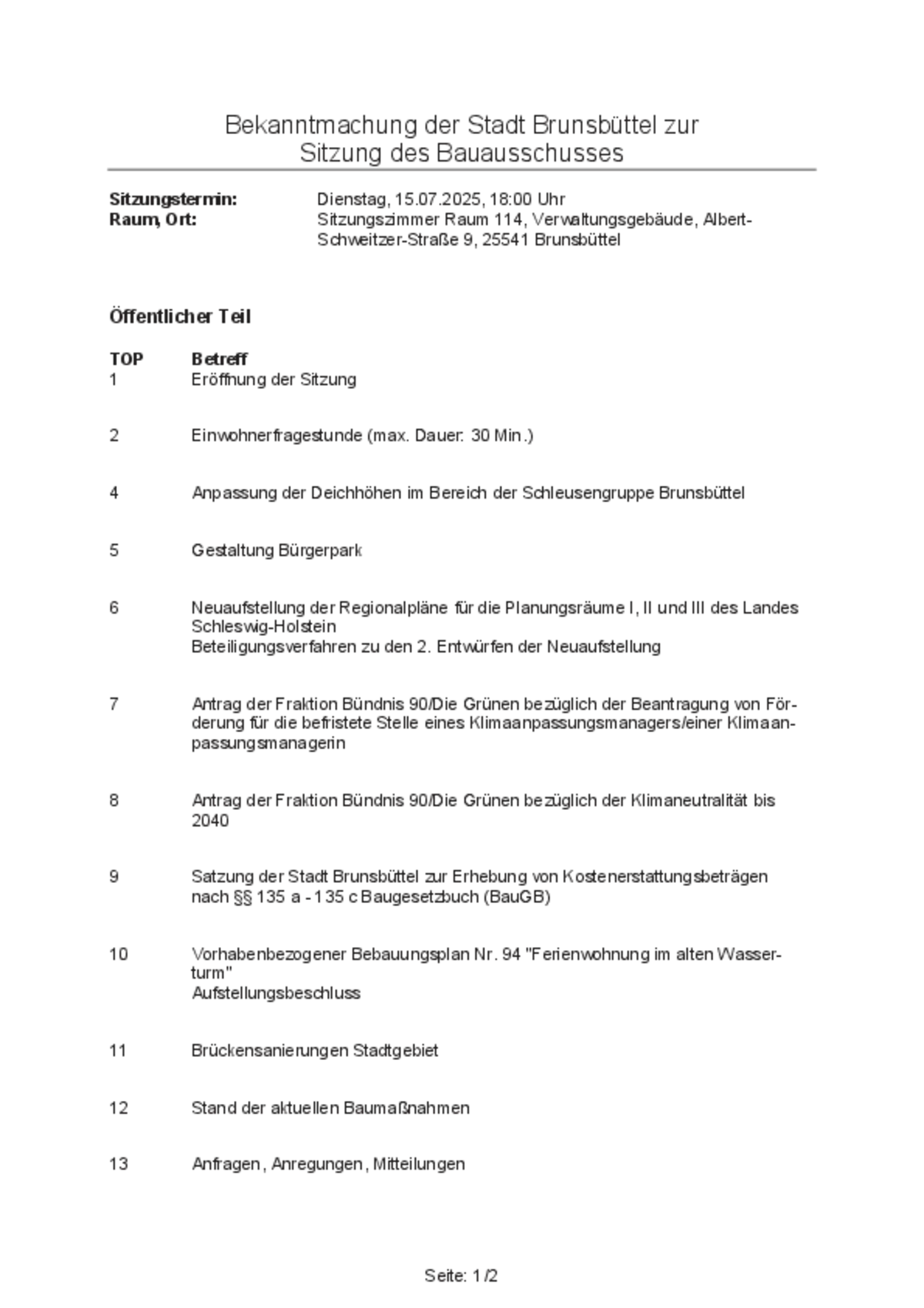 Die vorstehende Bekanntmachung 32/2025 der Stadt Brunsbüttel steht ab dem 04.07.2025 auf der Homepage der Stadt Brunsbüttel unter www.stadt.brunsbuettel.de zur Verfügung. Die Bekanntmachung enthält die Sitzung des Bauausschusses am 15.07.2025.