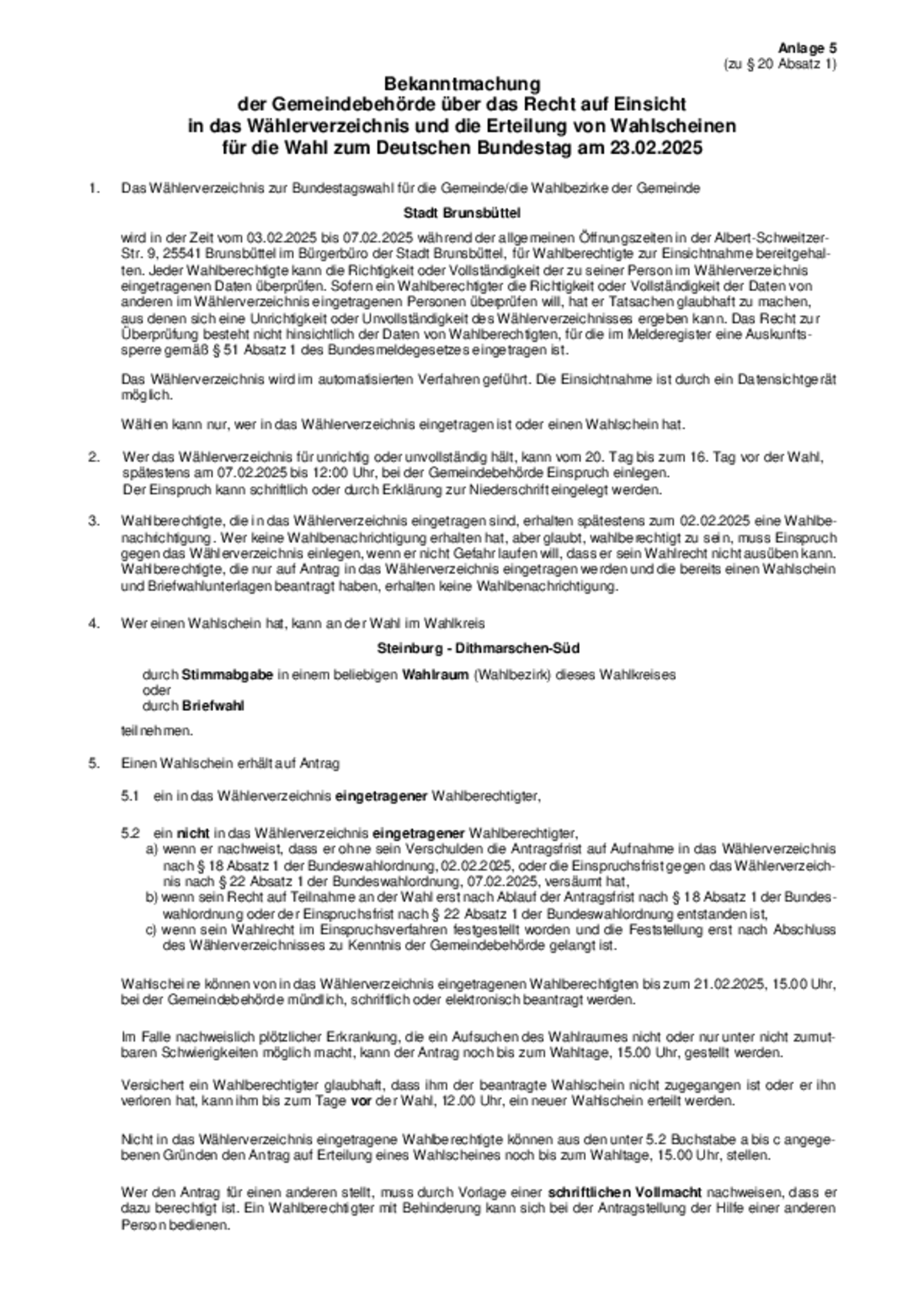 Die vorstehende Bekanntmachung 4/2025 der Stadt Brunsbüttel steht ab dem 27.01.2025 auf der Homepage der Stadt Brunsbüttel unter www.stadt.brunsbuettel.de zur Verfügung. Die Bekanntmachung enthält das Wählerverzeichnis für die Bundestagswahl am 23.02.2025.