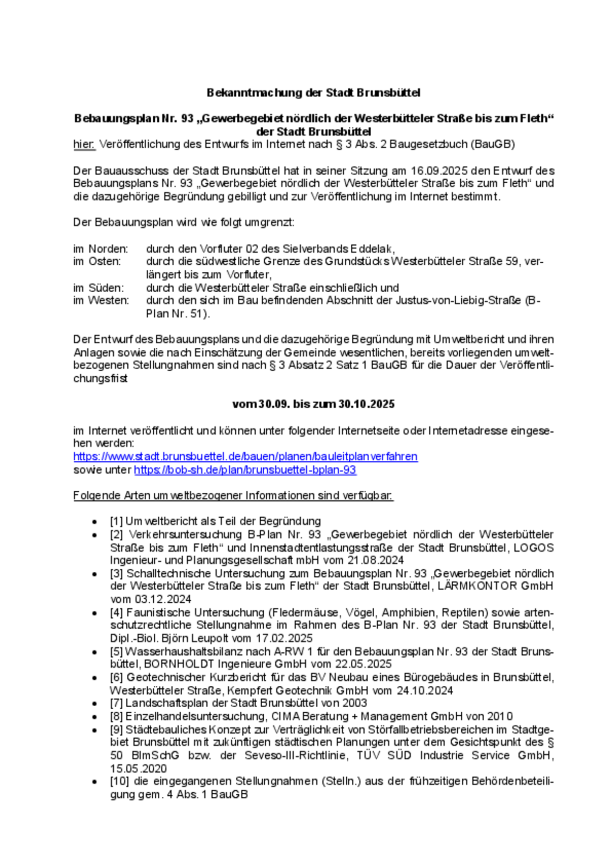 Die vorstehende Bekanntmachung 43/2025 steht ab dem 23.09.2025 auf der Homepage der Stadt Brunsbüttel unter www.stadt.brunsbuettel.de zur Verfügung. Die Bekanntmachung enthält die Veröffentlichung im Internet des Entwurfs des Bebauungsplans Nr. 93 „Gewerbegebiet nördlich der Westerbütteler Straße bis zum Fleth.