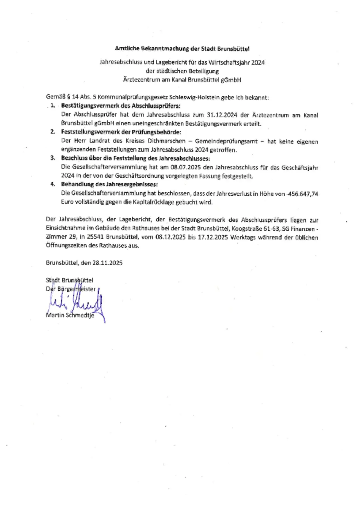 Die vorstehende Bekanntmachung 57/2025 der Stadt Brunsbüttel steht ab dem 03.12.2025 auf der Homepage der Stadt Brunsbüttel unter www.stadt.brunsbuettel.de zur Verfügung. Die Bekanntmachung enthält den Jahresabschluss und Lagebericht für das Wirtschaftsjahr 2024 der städtischen Beteiligung Ärztezentrum am Kanal Brunsbüttel GmbH.