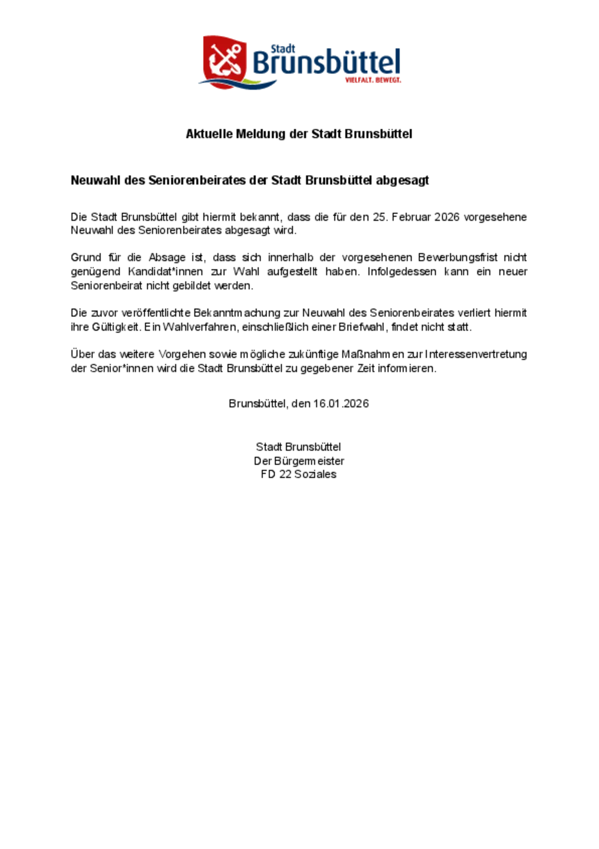 Die Stadt Brunsbüttel gibt hiermit bekannt, dass die für den 25. Februar 2026 vorgesehene Neuwahl des Seniorenbeirates abgesagt wird.