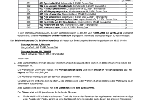 Die vorstehende Bekanntmachung 10/2025 der Stadt Brunsbüttel steht ab dem 13.02.2025 auf der Homepage der Stadt Brunsbüttel unter www.stadt.brunsbuettel.de zur Verfügung. Die Bekanntmachung enthält die Wahlbekanntmachung zum 21. Deutschen Bundestag am 23.02.2025.