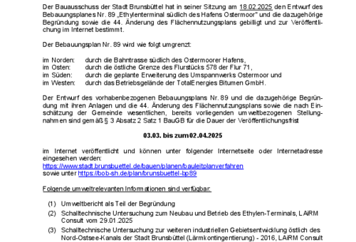 Die vorstehende Bekanntmachung 13/2025 der Stadt Brunsbüttel steht ab dem 25.02.2025 auf der Homepage der Stadt Brunsbüttel unter www.stadt.brunsbuettel.de zur Verfügung. Die Bekanntmachung enthält den Hinweis auf die Veröffentlichung des Entwurfes des B-Plans Nr.89 sowie der 44. Änderung des…