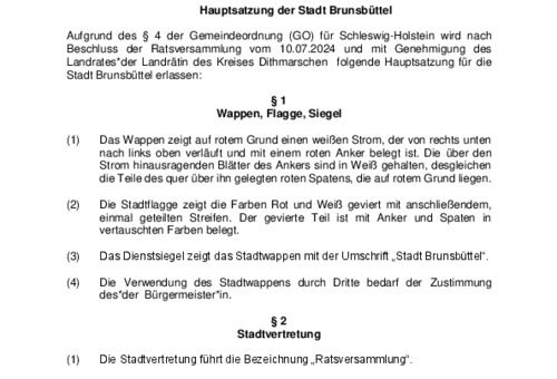Die vorstehende Bekanntmachung 03/2024 der Stadt Brunsbüttel steht ab dem 11.11.2024 auf der Homepage der Stadt Brunsbüttel unter www.stadt.brunsbuettel.de zur Verfügung. Die Bekanntmachung enthält die Neufassung der Hauptsatzung der Stadt Brunsbüttel.