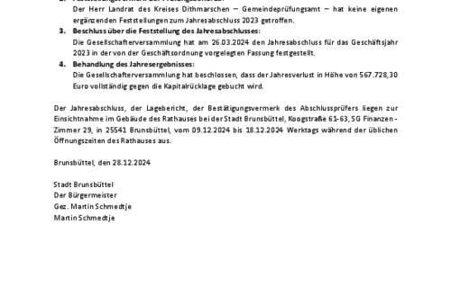 Die vorstehende Bekanntmachung 07/2024 der Stadt Brunsbüttel steht ab dem 02.12.2024 auf der Homepage der Stadt Brunsbüttel unter www.stadt.brunsbuettel.de zur Verfügung. Die Bekanntmachung enthält den Jahresabschluss 2023 des Ärztezentrum am Kanal.