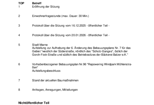 Die vorstehende Bekanntmachung 08/2026 der Stadt Brunsbüttel steht ab dem 09.02.2026 auf der Homepage der Stadt Brunsbüttel unter www.stadt.brunsbuettel.de zur Verfügung. Die Bekanntmachung enthält die Sitzung des Bauausschusses am 17.02.2026.