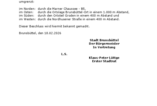 Die vorstehende Bekanntmachung 09/2026 der Stadt Brunsbüttel steht ab dem 23.02.2026 auf der Homepage der Stadt Brunsbüttel unter www.stadt.brunsbuettel.de zur Verfügung. Die Bekanntmachung enthält die Information über den Aufstellungsbeschluss zum vorhabenbezogenen Bebauungsplan Nr. 96 „Repowering…