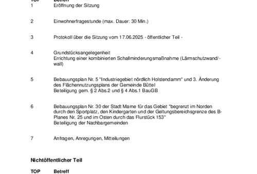 Die vorstehende Bekanntmachung 35/2025 der Stadt Brunsbüttel steht ab dem 16.07.2025 auf der Homepage der Stadt Brunsbüttel unter www.stadt.brunsbuettel.de zur Verfügung. Die Bekanntmachung enthält den Bebauungsplan Nr. 92 " Industriegebiet am Nord-Ostsee-Kanal zwischen dem Ostermoorweg, dem…