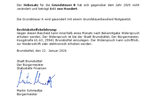 Die vorstehende Bekanntmachung 05/2026 der Stadt Brunsbüttel steht ab dem 27.01.2026 auf der Homepage der Stadt Brunsbüttel unter www.stadt.brunsbuettel.de zur Verfügung. Die Bekanntmachung enthält die Öffentliche Bekanntmachung über die Festsetzung der Grundsteuer für das Kalenderjahr 2026.