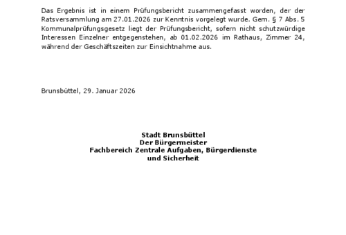 Die vorstehende Bekanntmachung 07/2026 der Stadt Brunsbüttel steht ab dem 29.01.2026 auf der Homepage der Stadt Brunsbüttel unter www.stadt.brunsbuettel.de zur Verfügung. Die Bekanntmachung enthält den Bericht über das Ergebnis der Prüfung des Gemeindeprüfungsamtes des Kreises Dithmarschen bei der…