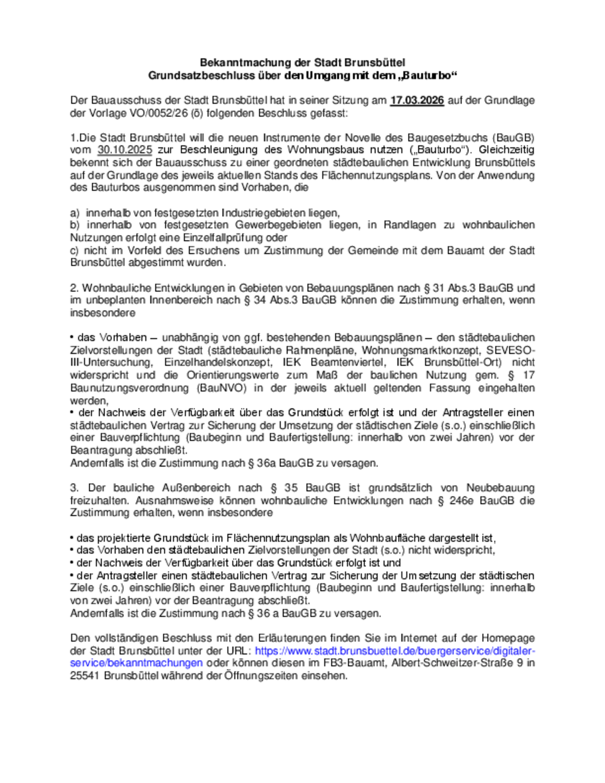 Die vorstehende Bekanntmachung 23/2026 der Stadt Brunsbüttel steht ab dem 15.04.2026 auf der Homepage der Stadt Brunsbüttel unter www.stadt.brunsbuettel.de zur Verfügung. Die Bekanntmachung enthält den Grundschatzbeschluss über den Umgang mit dem "Bauturbo".