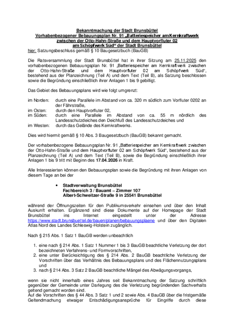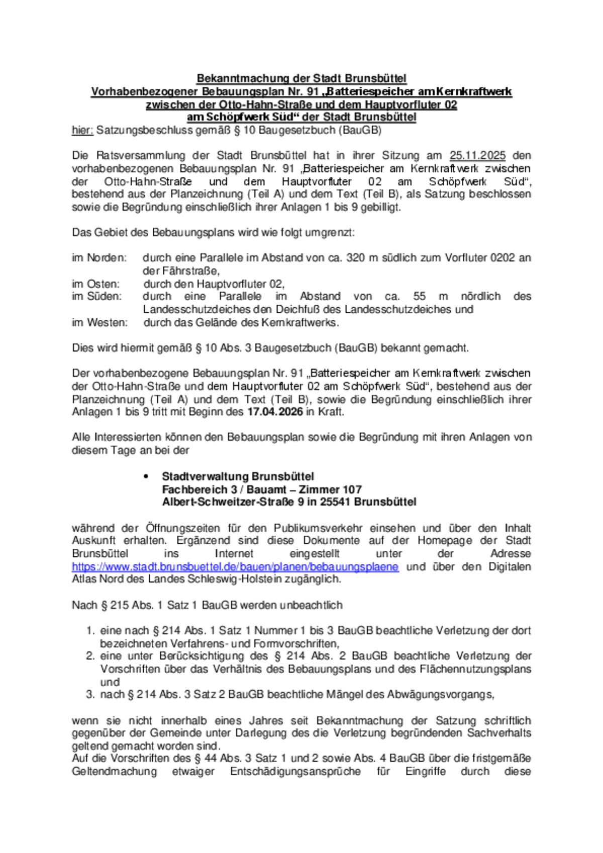 Die vorstehende Bekanntmachung 24/2026 der Stadt Brunsbüttel steht ab dem 16.04.2026 auf der Homepage der Stadt Brunsbüttel unter www.stadt.brunsbuettel.de zur Verfügung. Die Bekanntmachung enthält die Bekanntmachung des Satzungsbeschlusses des vorhabenbezogenen Bebauungsplans Nr.91 „Batteriespeicher am Kernkraftwerk zwischen der Otto-Hahn-Straße und dem Hauptvorfluter 02 am Schöpfwerk Süd“ gemäß § 10 Baugesetzbuch (BauGB).