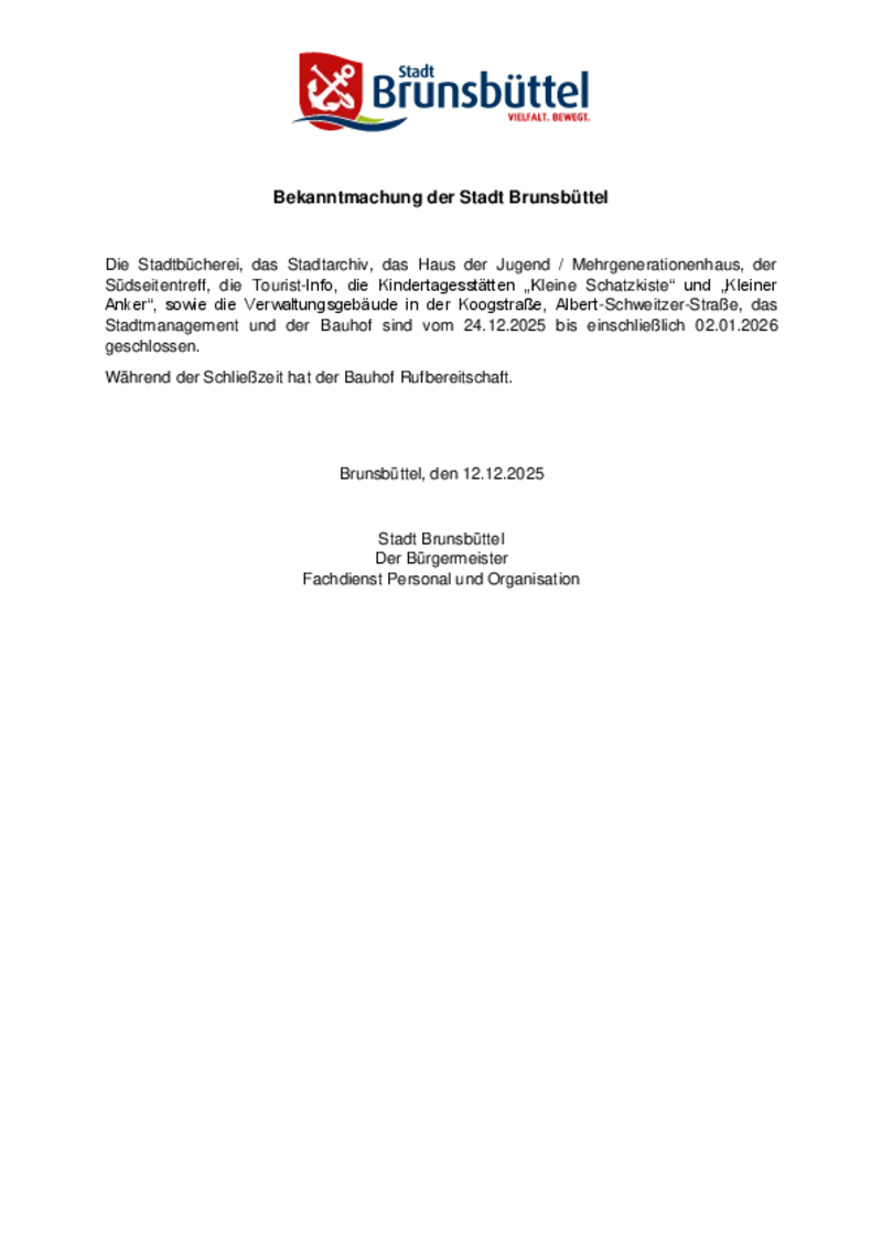 Schließzeiten Weihnachten 2025 Stadt Brunsbüttel