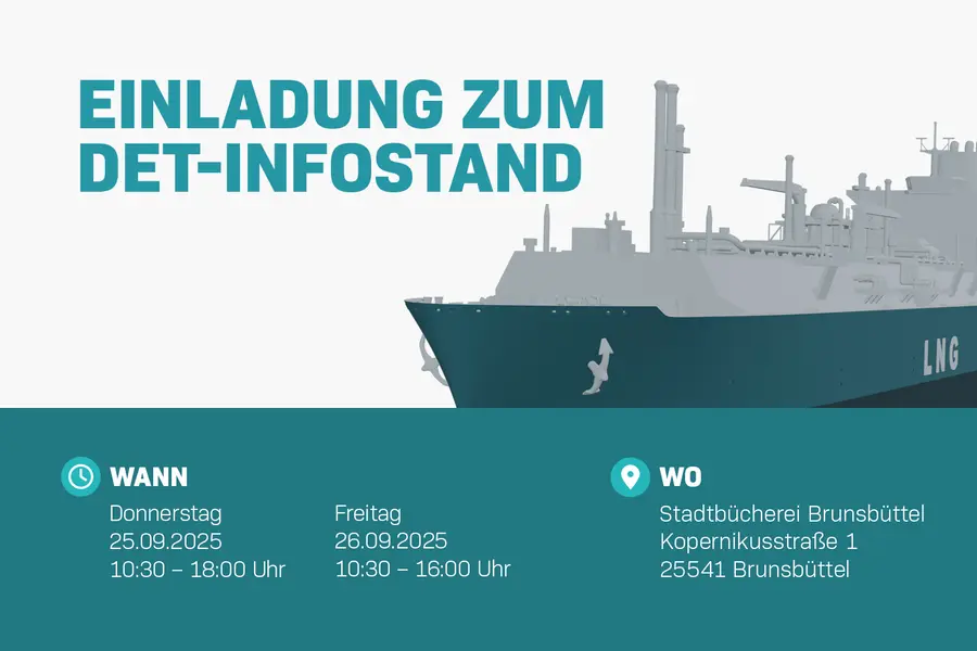 Technik erleben, Abläufe verstehen, ins Gespräch kommen: Die Deutsche Energy Terminal GmbH (DET) ist mit einem Infostand in der Stadtbücherei Brunsbüttel zu Gast. Vor Ort gibt es Einblicke in den Betrieb des schwimmenden LNG-Terminals „Höegh Gannet“ im Elbehafen Brunsbüttel sowie viel Zeit für Fragen und Antworten.