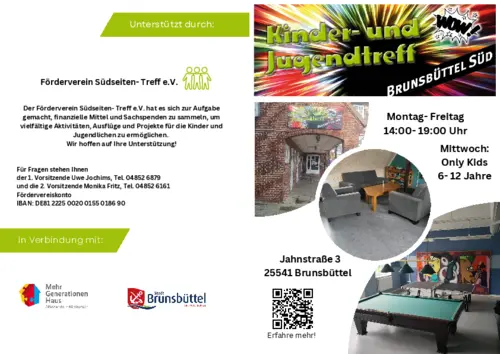 Besondere Unterstützung erhält der Kinder- und Jugendtreff Brunsbüttel Süd durch den Förderverein Südseiten — Treff e. V., welcher uns tatkräftig durch finanzielle Mittel und Sachspenden vielfältige Aktivitäten, Ausflüge und Projekte unterstützt.