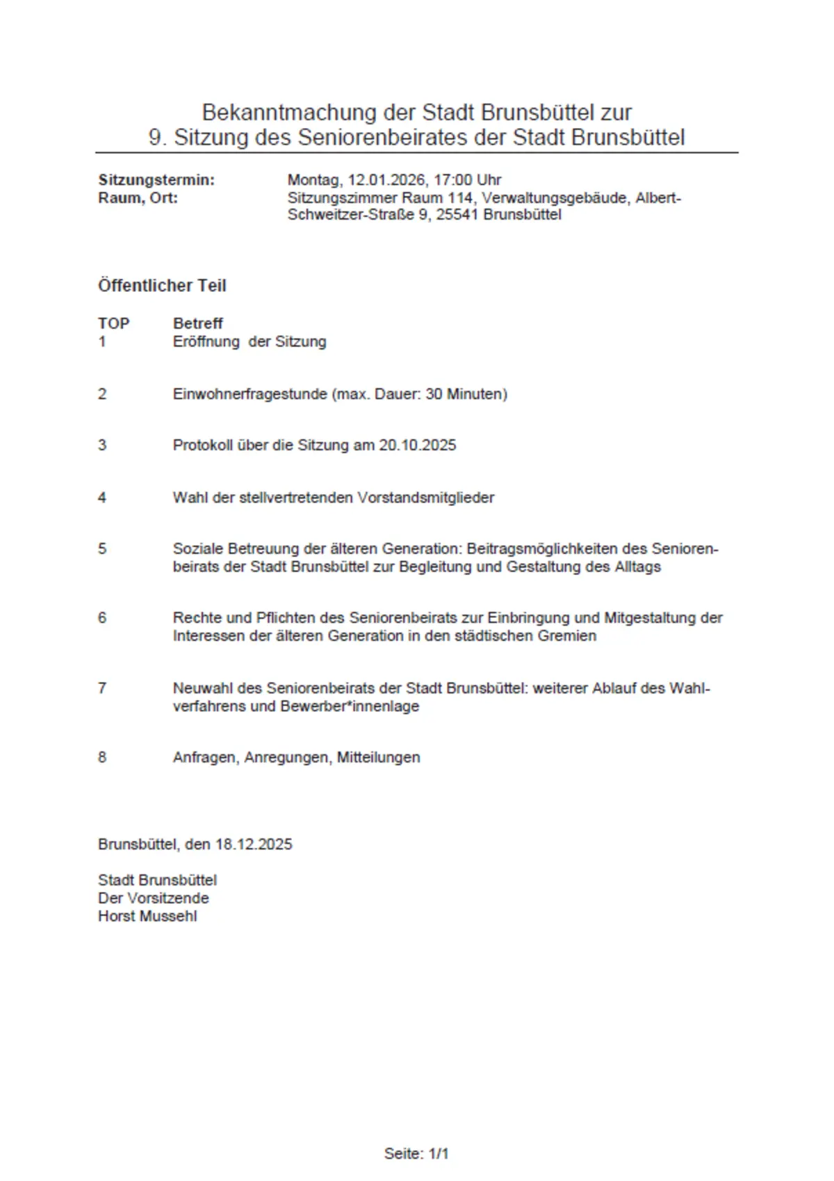 Die vorstehende Bekanntmachung betrifft die 9. Sitzung des Seniorenbeirates der Stadt Brunsbüttel. Die Sitzung ist öffentlich; interessierte Personen sind zur Teilnahme eingeladen.