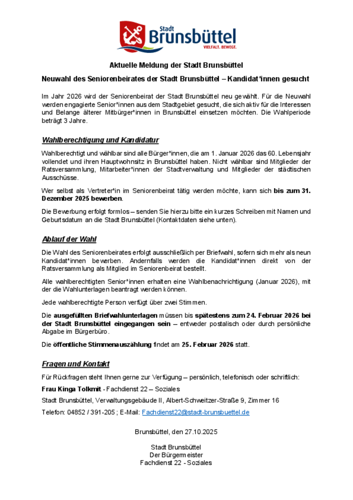 Im Jahr 2026 wird der Seniorenbeirat der Stadt Brunsbüttel neu gewählt. Für die Neuwahl werden engagierte Senior*innen aus dem Stadtgebiet gesucht, die sich aktiv für die Interessen und Belange älterer Mitbürger*innen in Brunsbüttel einsetzen möchten. Die Wahlperiode beträgt 3 Jahre.