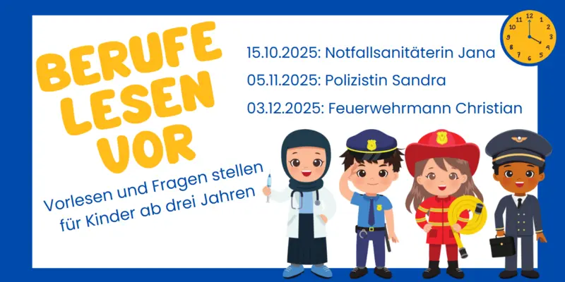 Den Auftakt macht am Mittwoch, 15. Oktober 2025 die Notfallsanitäterin Jana. Sie bringt nicht nur eine Geschichte mit, sondern gibt den Kindern auch Einblicke in ihren Beruf und erzählt, wie sie Menschen in Not hilft oder wie es ist mit Blaulicht durch eine Stadt zu düsen.